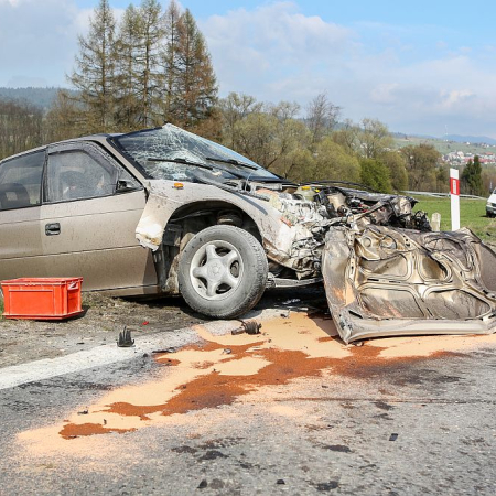 Samochód osobowy zderzył się czołowo z wywrotką wyładowaną kamieniami w Harklowej