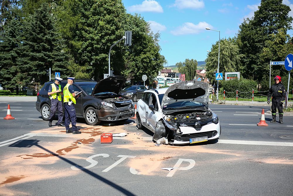 Zderzenie samochodów na skrzyżowaniu Al. 1000-lecia i Kopernika w Nowym Targu